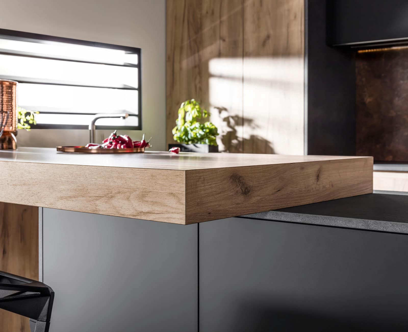 Przepiękne drewniane usłojenia zestawione z czernią, szczegóły aranżacji dopracowane z największą precyzją.